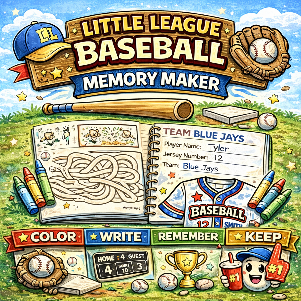 A: The Baseball Memory Maker Book is a 10-page printable PDF designed to help young baseball players reflect on their season in a fun, screen-free way. Kids can color, draw, check boxes, and write about their team, games, teammates, and favorite moments — creating a keepsake they’ll love looking back on.